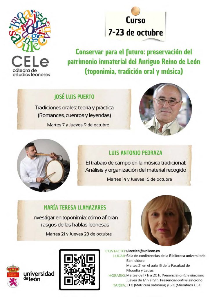 La Cátedra de Estudios Leoneses (CELe) organiza el curso “Conservar para el futuro: preservación del patrimonio inmaterial del antiguo Reino de León (toponimia, tradición oral y música)” entre los días 7 y 23 de octubre.